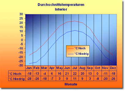 Die Winter sind eisig kalt und fallen auf Durchschnittswerte von minus 26°C, Extremwerte bis zu minus 48°C können verschiedentlich auftreten.