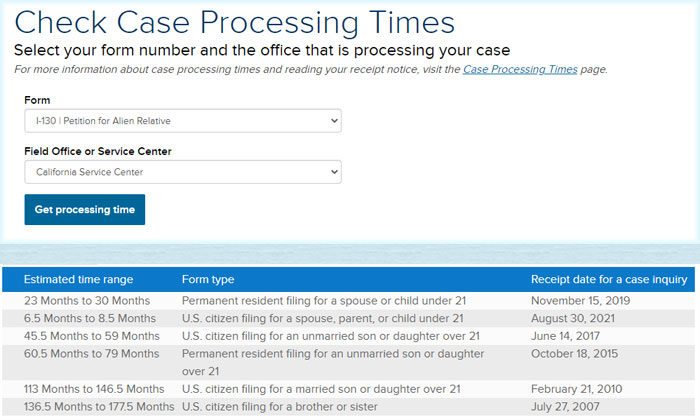 Die ungefähren Bearbeitungszeiten in den einzelnen USCIS-Büros können Sie hier abfragen. Sie müssen dazu die zu von Ihnen eingereichte Form Nummer und den Namen des Field Office oder Service Centers eingeben.
